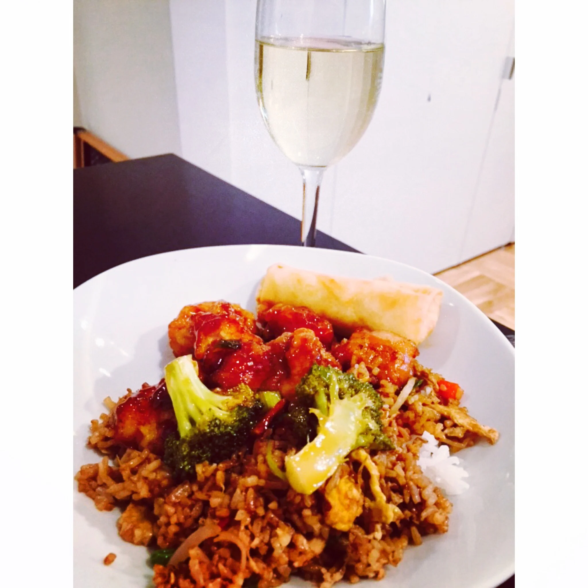 Vegetarian rice, spicy orange chicken, spring rolls forever.